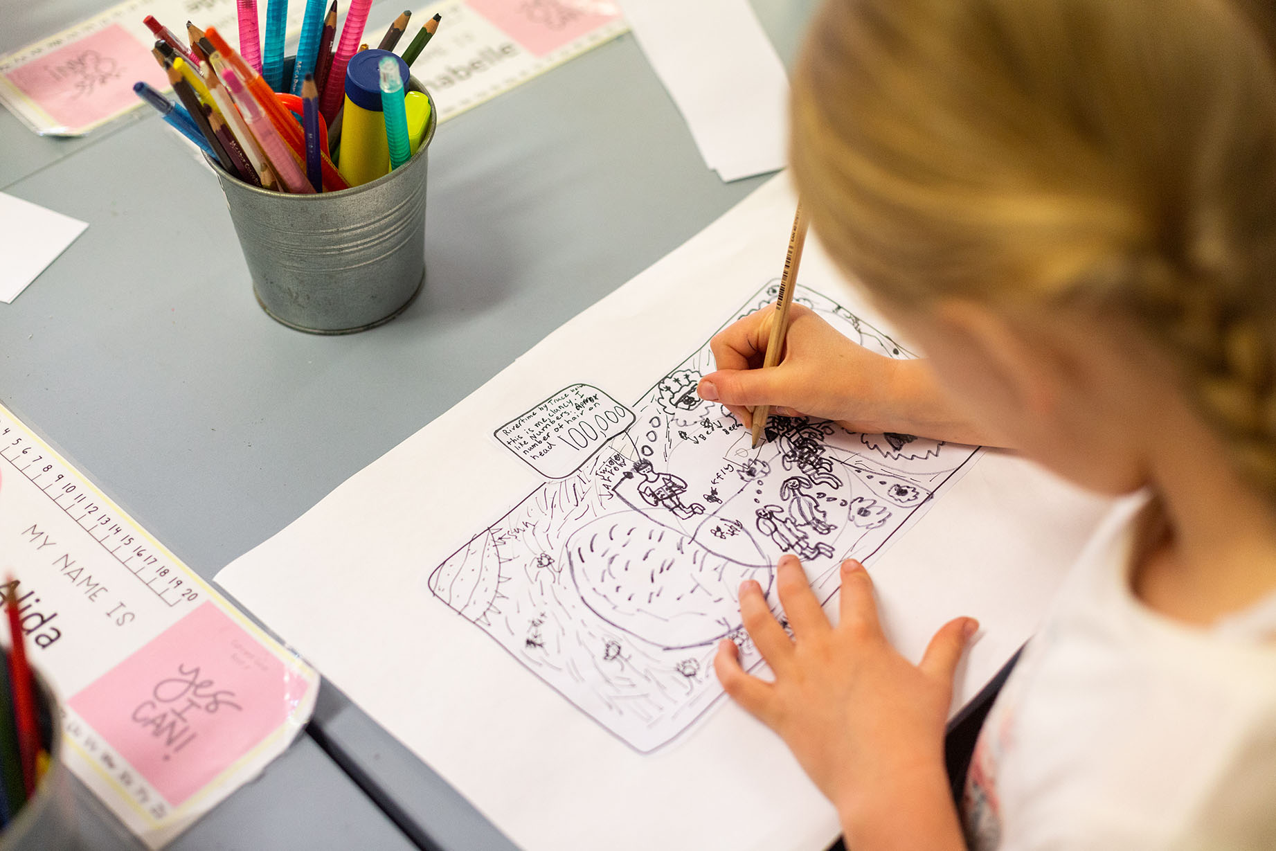 This quickly became a focus for the remainder of the term and continues into our project for term 4. The students work in groups, focussed on a ‘chapter’ each, outlining each Creative Schools sessions and are making decisions regarding the illustrations, the text, the speech bubbles and narration, characterisation and focus. Collaboration, persistence and discipline is being demonstrated, developed and highlighted each session as the girls work together to create something original and based on their lived experiences.